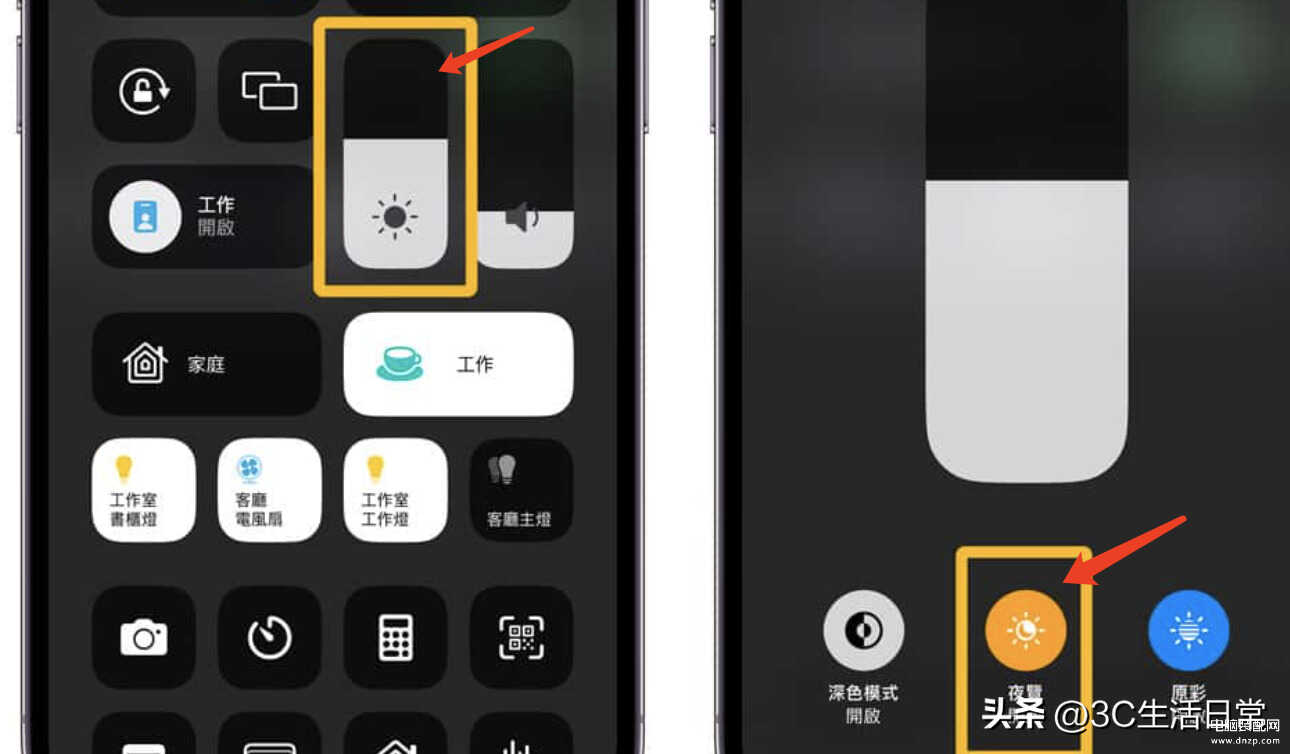 方法一:手机屏幕右上角下拉控制中心,长按屏幕亮度显示条,点击关闭夜览。