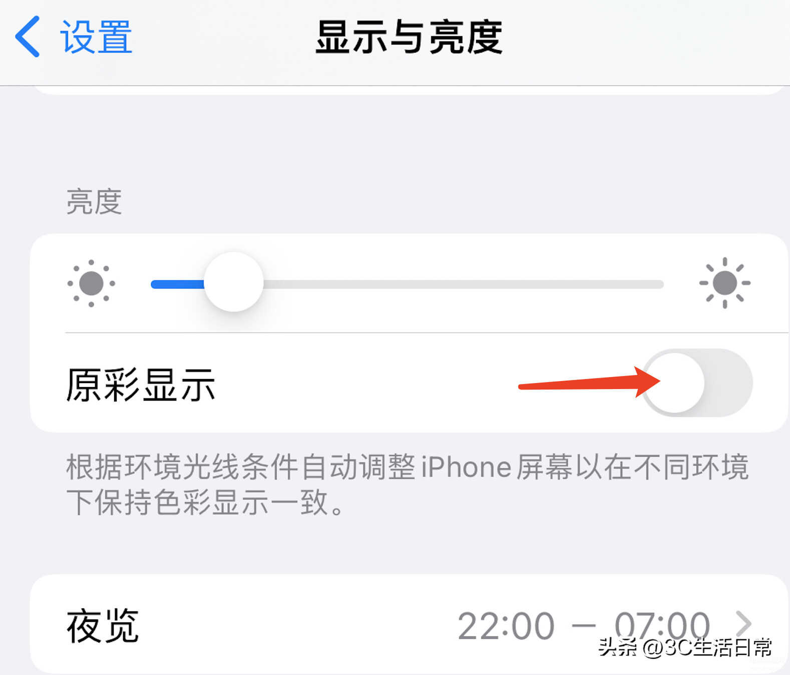 如果你觉得关闭原彩和夜览功能,虽然屏幕不发黄了,但是眼睛看久了很刺眼;这时我们可以在设置 - 辅助功能 - 显示与文字大小,开启“降低白点值”,并将亮度调整到对你眼睛舒适的值。