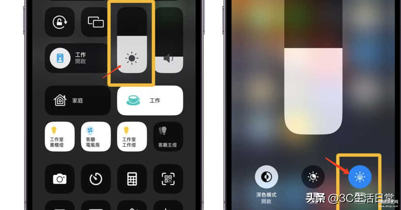 方法一:手机屏幕右上角下拉控制中心,长按屏幕亮度显示条,点击关闭原彩显示。