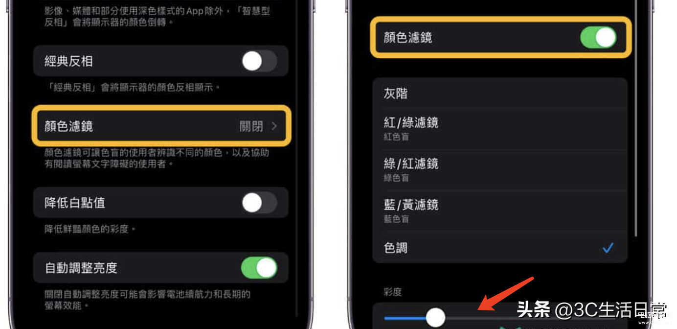 依次打开:设置 - 辅助功能 - 显示与文字大小 - 打开“色彩滤镜” - 选择“色调”,就可以通过调节“强度”和“色调”来调整iPhone手机的屏幕颜色。