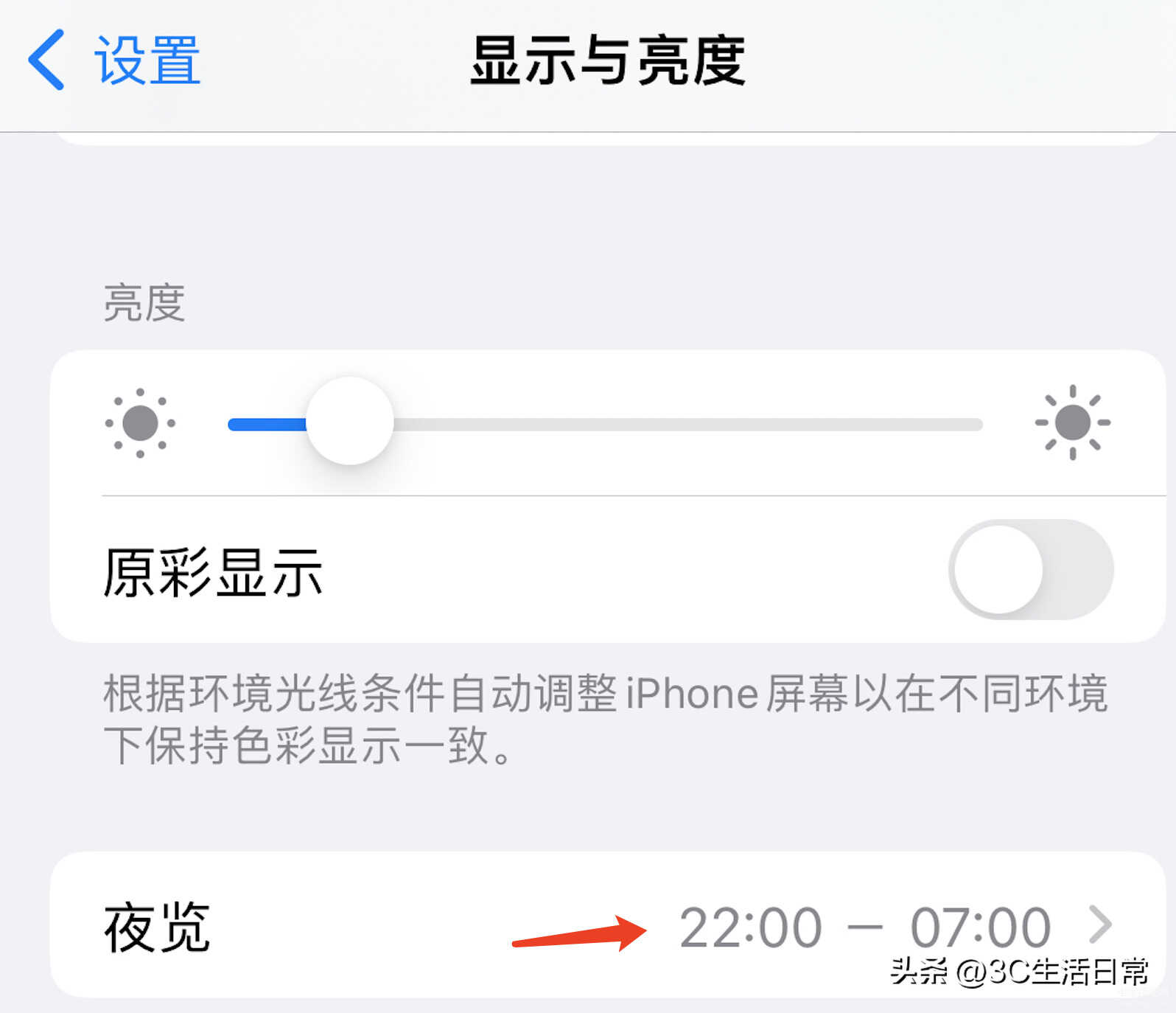 通常iPhone夜览功能,系统默认设置为晚上10点后自动开启,早上睡觉醒来7点会自动关闭,如果不太需要这项功能,可以进行关闭。