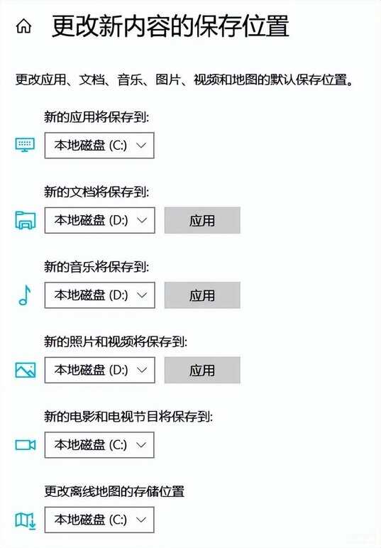 在这个页面里,我们就可以更改应用、文档、音乐、照片、视频等内容的默认保存位置,尤其是微信的自动缓存,每次都会堆很多!导致电脑变慢。