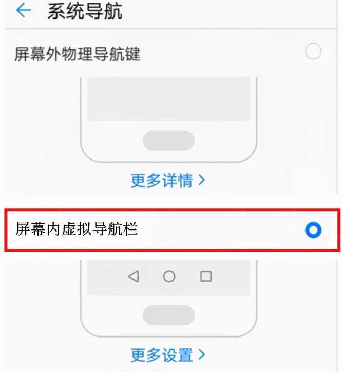 如果对样式不喜欢,可以点击“屏幕内虚拟导航栏”,下面的“更多设置”进行样式更改,保存后返回主页面,就能在系统底部看到虚拟按键了。