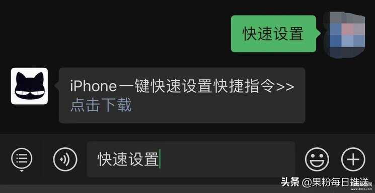 进入公众号后,点击右上角的“发消息”按钮在对话框发送关键字“快速设置”获取这个快捷指令。