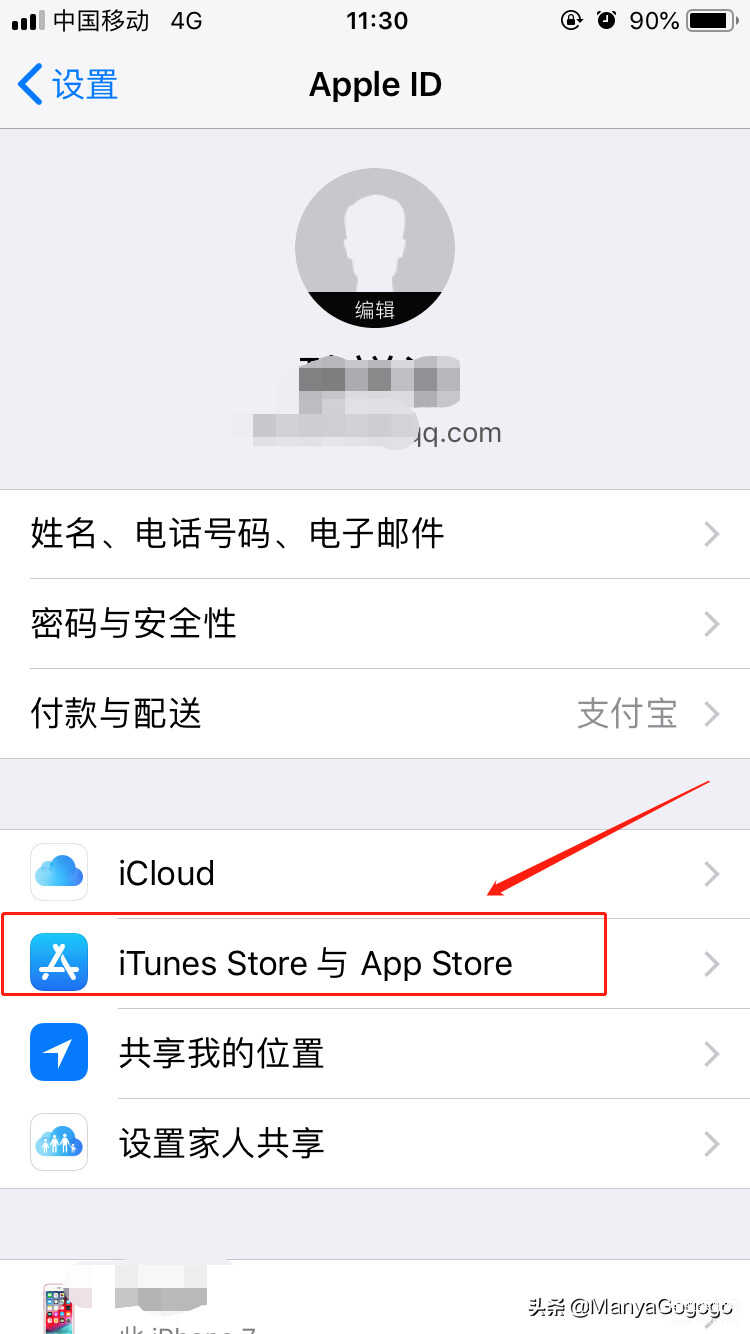 2、 进入“设置”界面后最上面的“Apple ID、iCloud、iTunes与App store”。