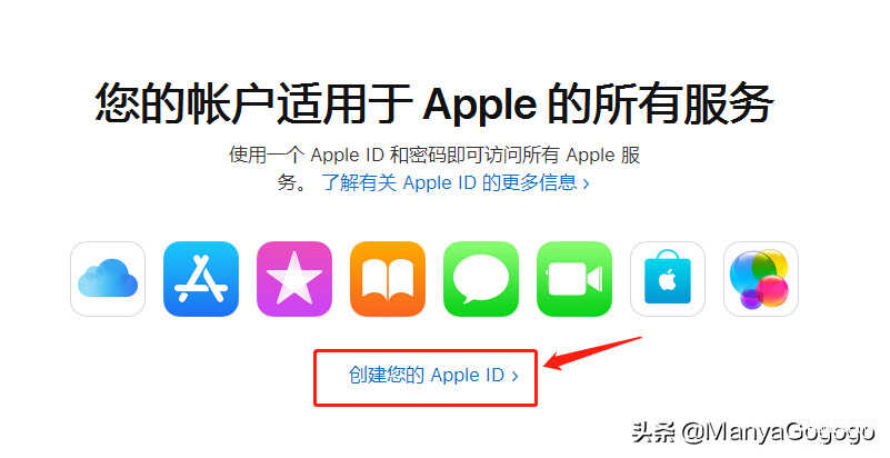 2、 点进去之后呢,可以看到图标一排图标下面有个“创建您的Apple ID”,点击进去,就会进入注册界面。