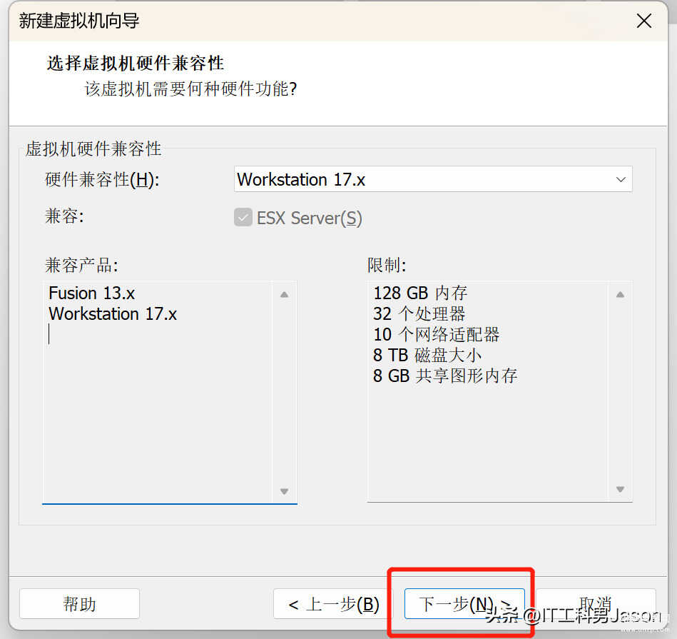 4、选择虚拟机硬件兼容性:直接点击“下一步”