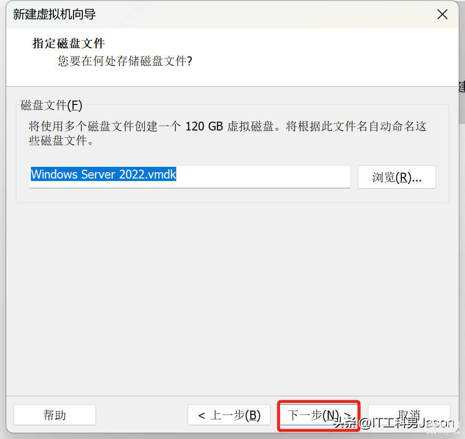 15、指定磁盘容量:这里的话我把最大磁盘大小更改为了120GB,因为我的物理磁盘足够大,如果是物理磁盘不是很大的话,可以保持默认的60GB就行,最后点击下一步