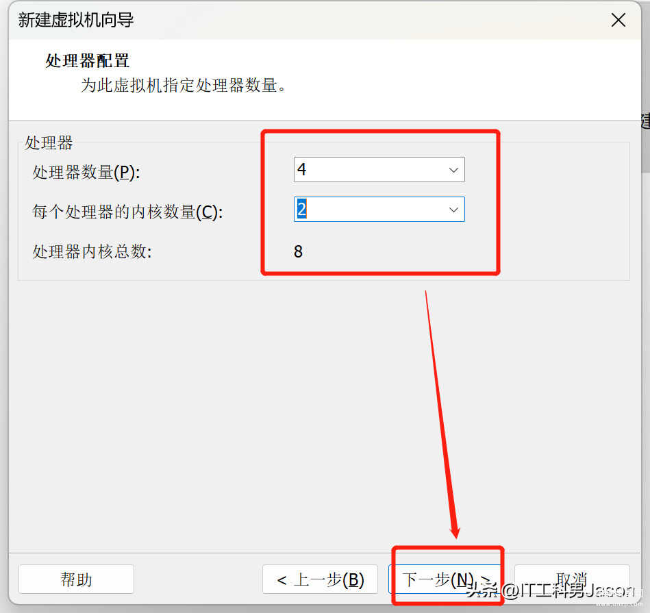 9、处理器配置:处理器配置这里的话,根据自己物理机的处理器数量来进行选择就行,然后最后还是点击下一步