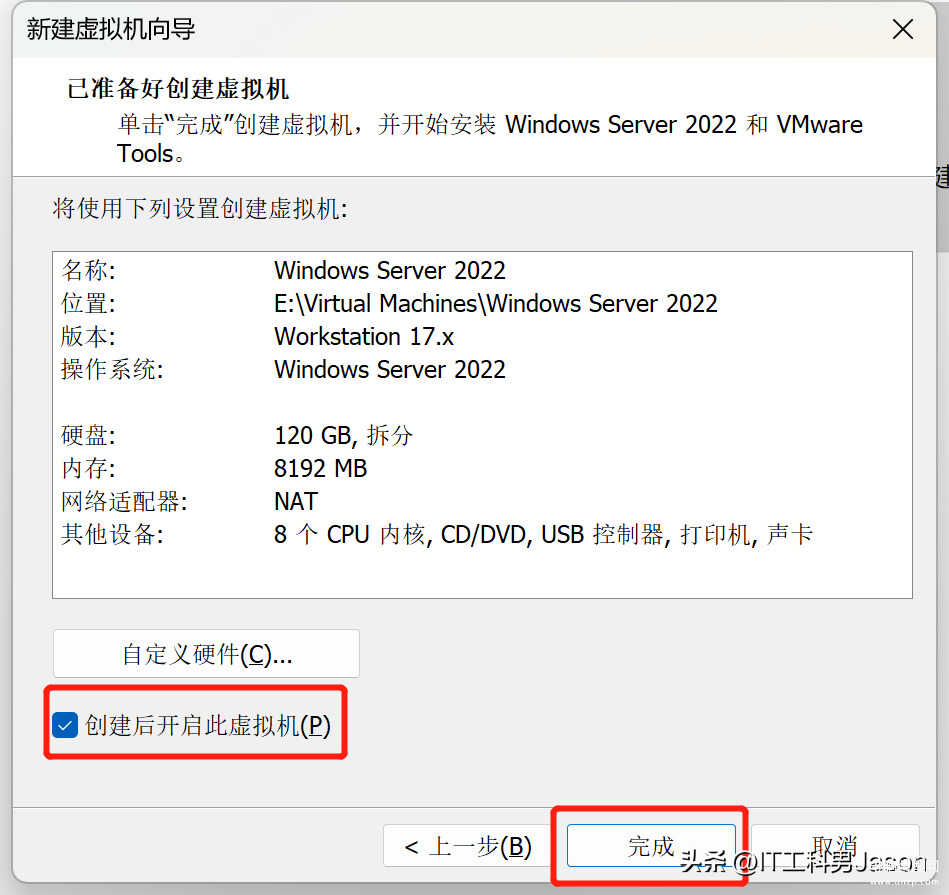 17、已准备好创建虚拟机:这一步的话有一点需要注意的地方,就是这个左下角有一个创建后开启此虚拟机的一个复选框,这个复选框勾选并点击完成,它会自动开启这个虚拟机,如果不勾选,那么点击完成后,需要手动去开启这个虚拟机,最后一步点击完成
