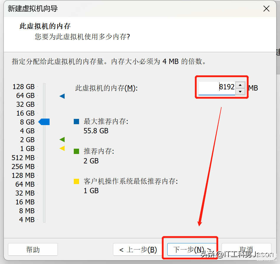 10、此虚拟机内存:这里根据自己物理机的内存来进行选择配置就行,然后最后点击下一步