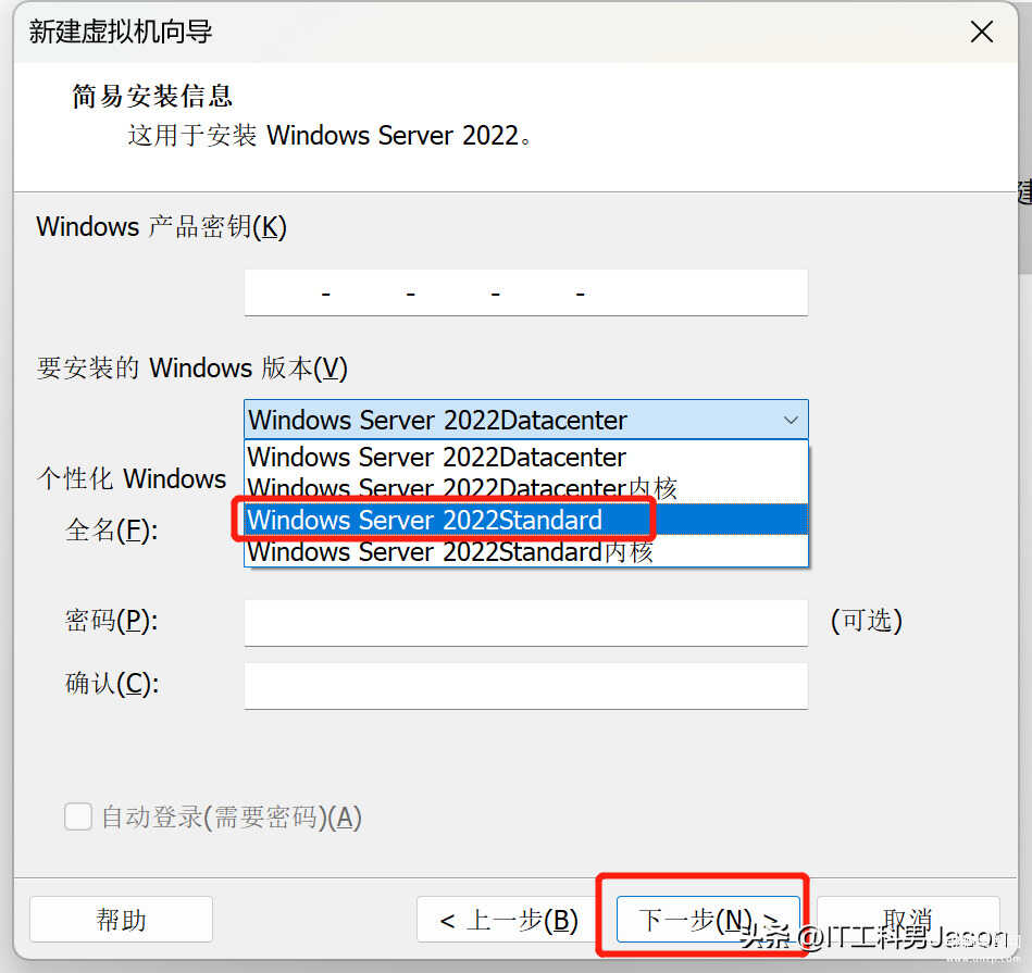 6、选择“要安装的Windows版本”,然后“全名”可以随便设置一个,密码可以暂时先不设置,然后这个Windows产品密钥的话可以先不用管它,最后点击“下一步”