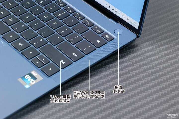 这款笔记本的其他核心硬件还包括WIFI6无线网卡、720P红外二合一摄像头、HUAWEI SOUND高低音分频扬声器以及1.5mm键程的高触感键盘、指纹电源键等等。