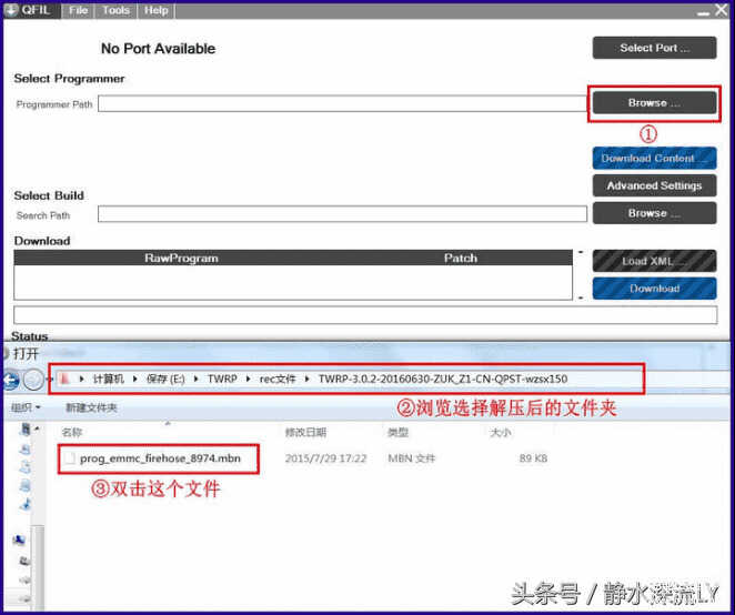 3.打开QFIL软件,选择Browse按钮,找到线刷包解压后的路径,双击