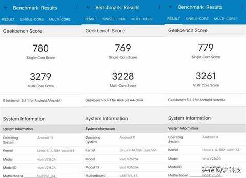 在Geekbench跑分中,为了排除单次单侧的不确定性,我们连续测试了三次,可以看到天玑1100的单核成绩稳定在780分左右,多核成绩稳定在3200分左右,这个成绩与高通骁龙865不相上下,基本就是次旗舰手机的档次。