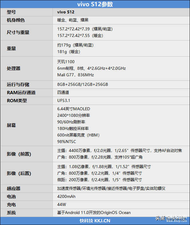 此外vivo S12的电池容量为4200mAh,支持44W闪充,以下是vivo S12的详细参数。