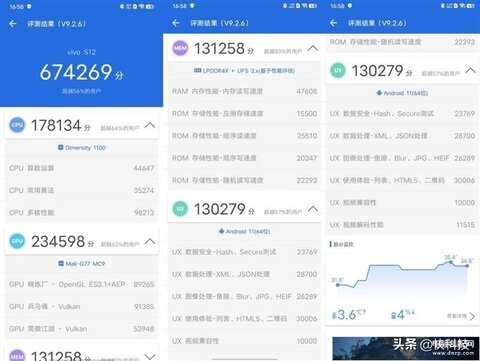 在安兔兔测试中,vivo S12的总得分为674269分,其中CPU得分为178134分,GPU得分为234598分,MEM得分为131258分,UX得分为130279分,测试期间手机温度上涨了3.6℃。