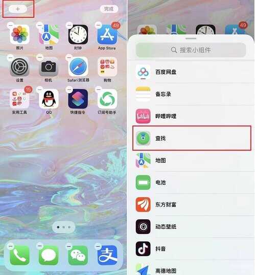 接下来为了查找方便,你还可以在主屏幕将查找APP添加小组件,长按手机屏幕点击左上角的“+”号,然后找到查找小组件进行添加到主屏幕即可。