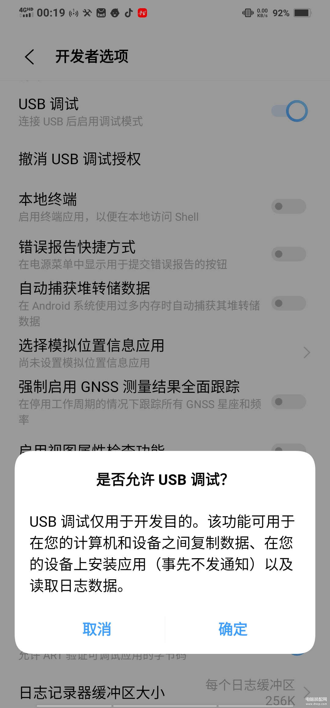 在开发者选项里找到“USB调试”项,打开,会跳出一个对话框,如下图,点击确认就可以了。(在这里我们仅是复制照片和视频等,不安装应用,故建议仅仅打开USB调试就好,不用打开开发者选项,带来风险。)