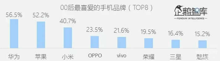 企鹅智库发布报告称,00后最喜爱的手机品牌中,华为、苹果、小米位列前三,排在4到8名的分别是OPPO、vivo、荣耀、三星和魅族。