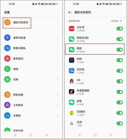 当然,只有微信开启还不行,手机也得要允许微信来消息提醒才可以。手机的开启方法是点击手机的【设置】-【通知与状态栏】,找到【微信】,将右边的开关打开即可。
