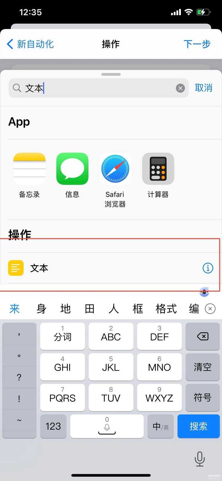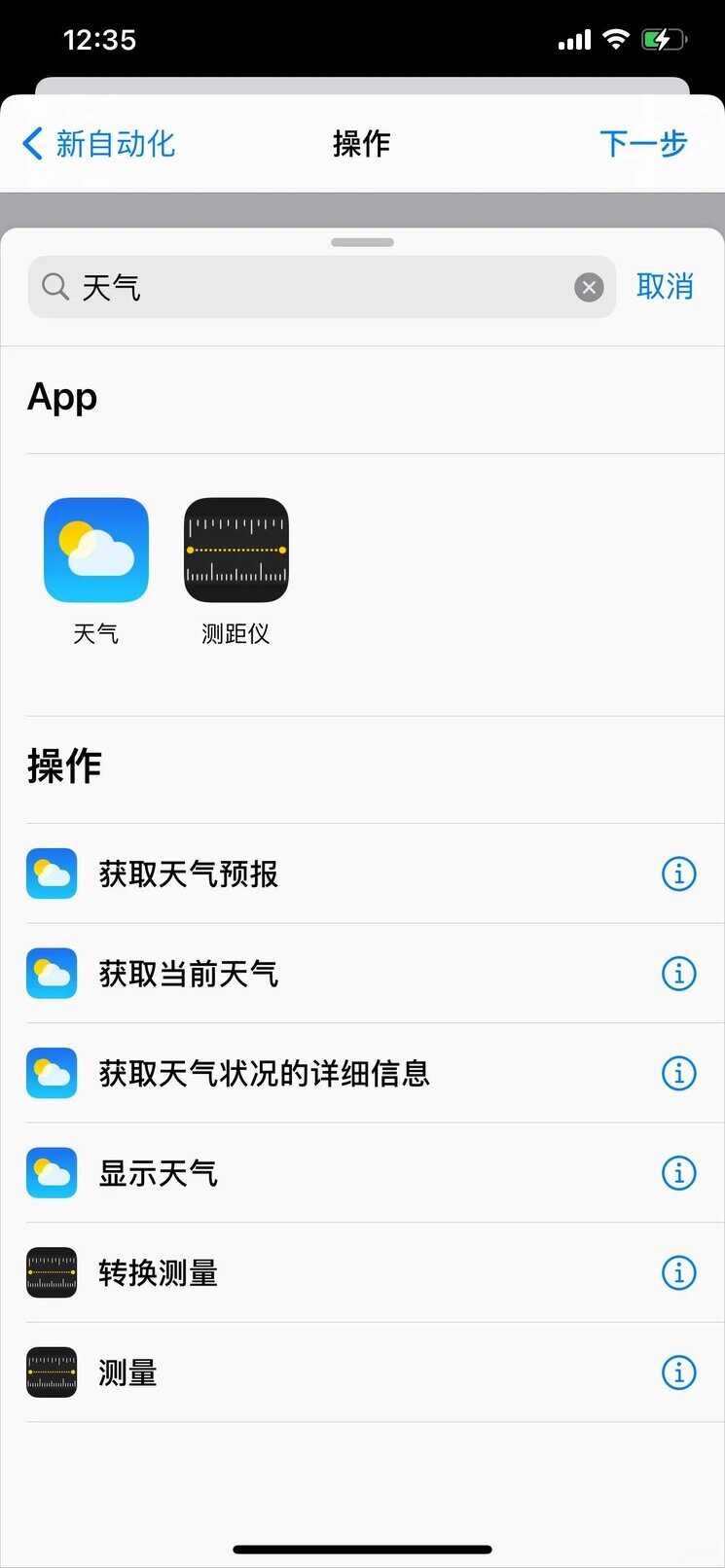 第三步:点击中间的+号,进入操作界面,在搜索栏里打上天气,点击获取当前天气
