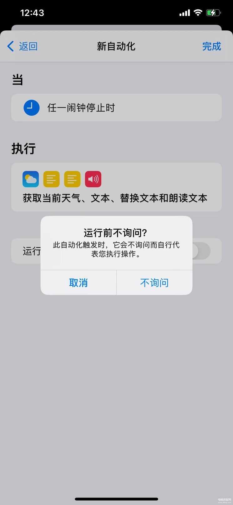 点击不询问,然后完成,这样你每天起床闹钟结束后就可以听到手机自动给你报告今天的天气气温了
