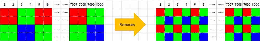所以为了让Quad Bayer图像可以被目前普通的ISP处理,需要对CMOS输出的Quad Bayer图像进行一定的处理,将它变为一个正常Bayer排列的图像再交由ISP处理,我们才能得到一张更高解析力的照片,而把Quad Bayer变为Bayer阵列这个步骤我们称之为Remosaic。
