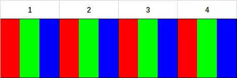 首先我们知道一般的显示设备(Pentile排列不谈了……)上指的一个像素通常由红绿蓝三原色组成,如下图我们称之为4个像素,每个像素都可以通过组合红绿蓝三色而独立显示出各种颜色。