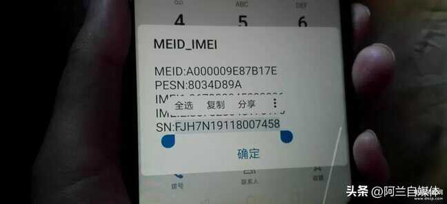 我们首先打开手机的拨号键,然后在里面输入“*#06#”,注意看,下方立刻出来了几串代码,在这里我们只需要看最后一个代码,SN开始的代码,我们用手指把它长按两秒,注意看,上方出现了一个“复制”,我们移动下方的光标,移动到SN后边的冒号后边的内容,因为我们只需要复制这一段内容,然后点“复制”!