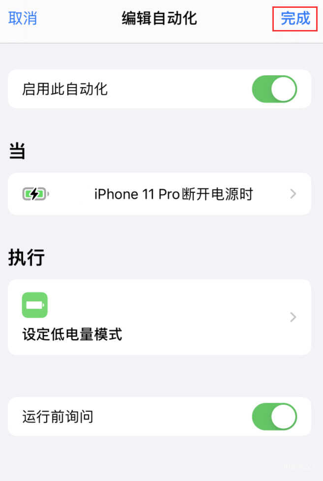 小提示:如果您开启了“运行前询问”,那么 iPhone 会弹出对话框询问您是否要开启低电量模式。也可以将“运行前询问”关闭,这样 iPhone 就会在断开电源时自动开启低电量模式,不需要您在对话框中确认。