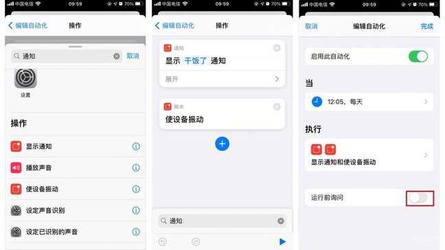 创建自动化:选择添加个人自动化,选择特定时间,搜索快捷指令,选择“运行快捷指令”,最后选择刚才设定的快捷指令,取消勾选“运行前询问”,最后点击完成。