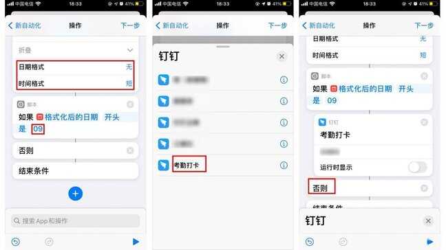 选择如果“格式化后的日期”开头是“09”(根据具体情况填08或者09),最后搜索“钉钉”,点击后选择“考勤打卡”,将“考勤打卡”模块拖动到“否则”前。