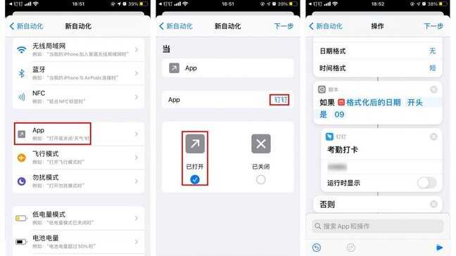 针对打卡,其实还有另一种相对更好的设置,即在指定时间段打开钉钉自动进入打卡页面。触发条件为“打开APP时”,选择“钉钉”,操作部分与前边一致。