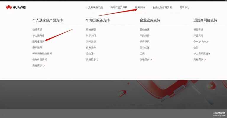 如果以上均无法解决问题,那就只能联系售后解决了。首先进入华为官网,点击服务支持-服务店查询。