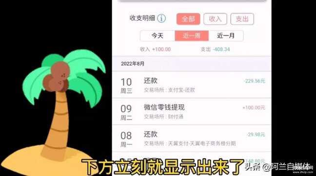 注意看下方还有具体的收支明细,有全部、收入、支出、今天、近一周,近一个月,比如说你想知道近一周时间的收支明细,我们就把“近一周”点开,下方立刻就显示出来了,这一周你的消费情况、还款情况和提现情况,每一笔都是很清晰的,是不是很方便?