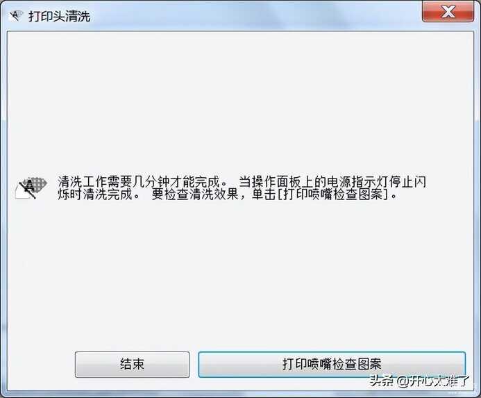 等待一会儿,打印机就清洗完成了。可以重新“打印喷嘴检查图案”,查看清洗效果。如果效果可以就“结束”。如果效果仍旧不好,可以重新清洗喷头。