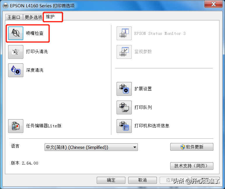 “维护”中找到二级菜单“喷嘴检查”或者“清洗打印头”