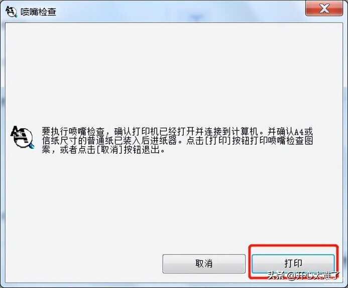 点击“打印”。打印机上会打印出来一张喷嘴检查图案。