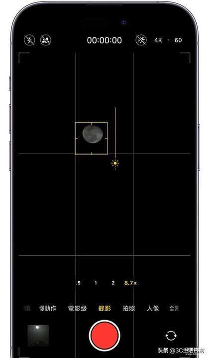 点击屏幕中的月亮,出现黄色方框后,向下滑动,将月亮的曝光度调到最低。这时候就会发现月亮变得清晰,月球表面的坑洞也依稀可见。