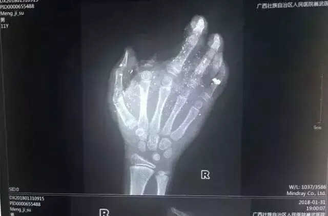2018年1月,广西一小男孩手掌被充电的手机炸得血肉模糊,右手食指被炸没了,拇指、中指、无名指也都炸伤。