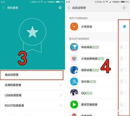 打开 安全中心-授权管理-自启动管理-如下图中4,关闭所有不必要的自启动项目。