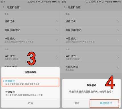打开 设置-电量和性能-性能和效果-选择流畅模式,此时会弹出下图中4所示的选项框,选择确定并重启,到这一步重启完成后就能明显感受到优化效果了。