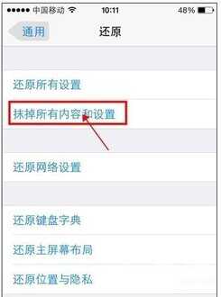 三.抹掉所有内容和设置。在iphone 设置--通用--还原--抹掉所有内容和设置。如果是越狱的用户,首先要升级操作系统在还原出厂设置。