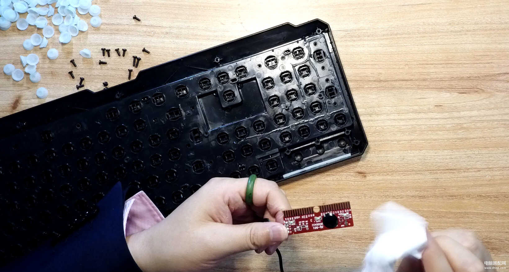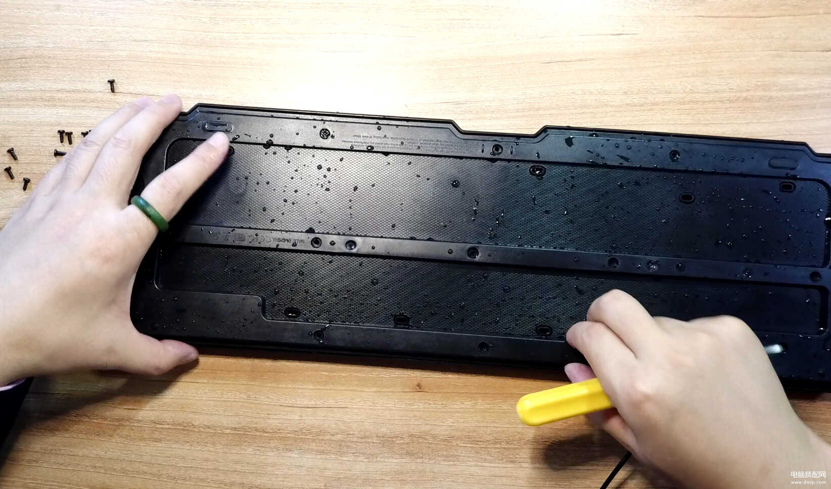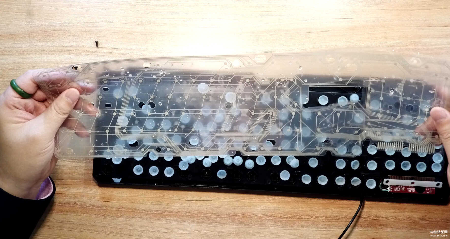 拿出这个薄膜,将它擦干净(薄膜键盘就是因为有这层膜,有别于机械键盘)。▲