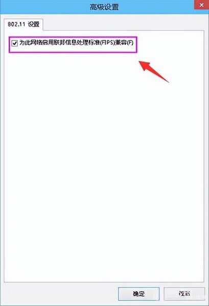 5、勾选【为此网络启用联邦信息处理标准(FIPS)兼容】这一项,然后确定。如图所示: