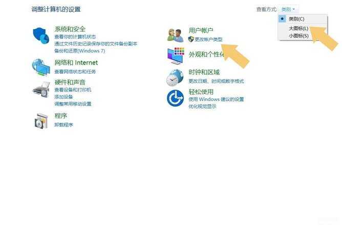 打开控制面板以后,将界面切换至类别,在弹出的界面里找到用户帐户,点击更改帐户类型。如下图: