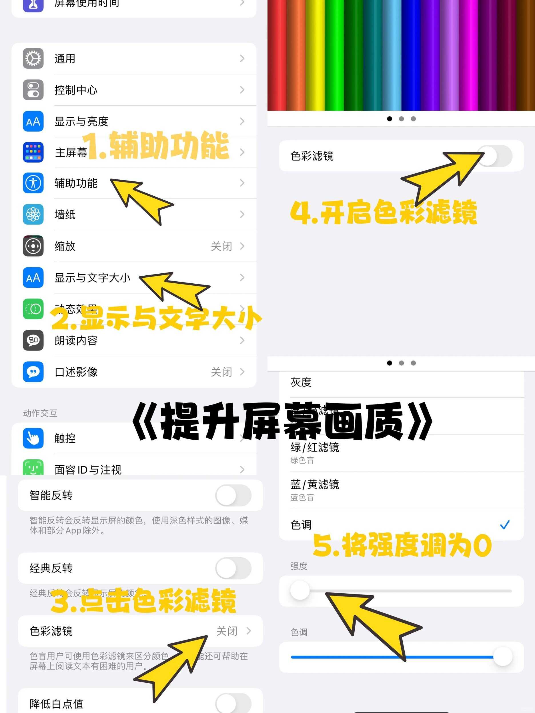 2⃣️设置-辅助功能-显示与文字大小-色彩滤镜-开启色彩滤镜-将强度调为0,也可以根据自己需求进行微调(提升屏幕的画质)