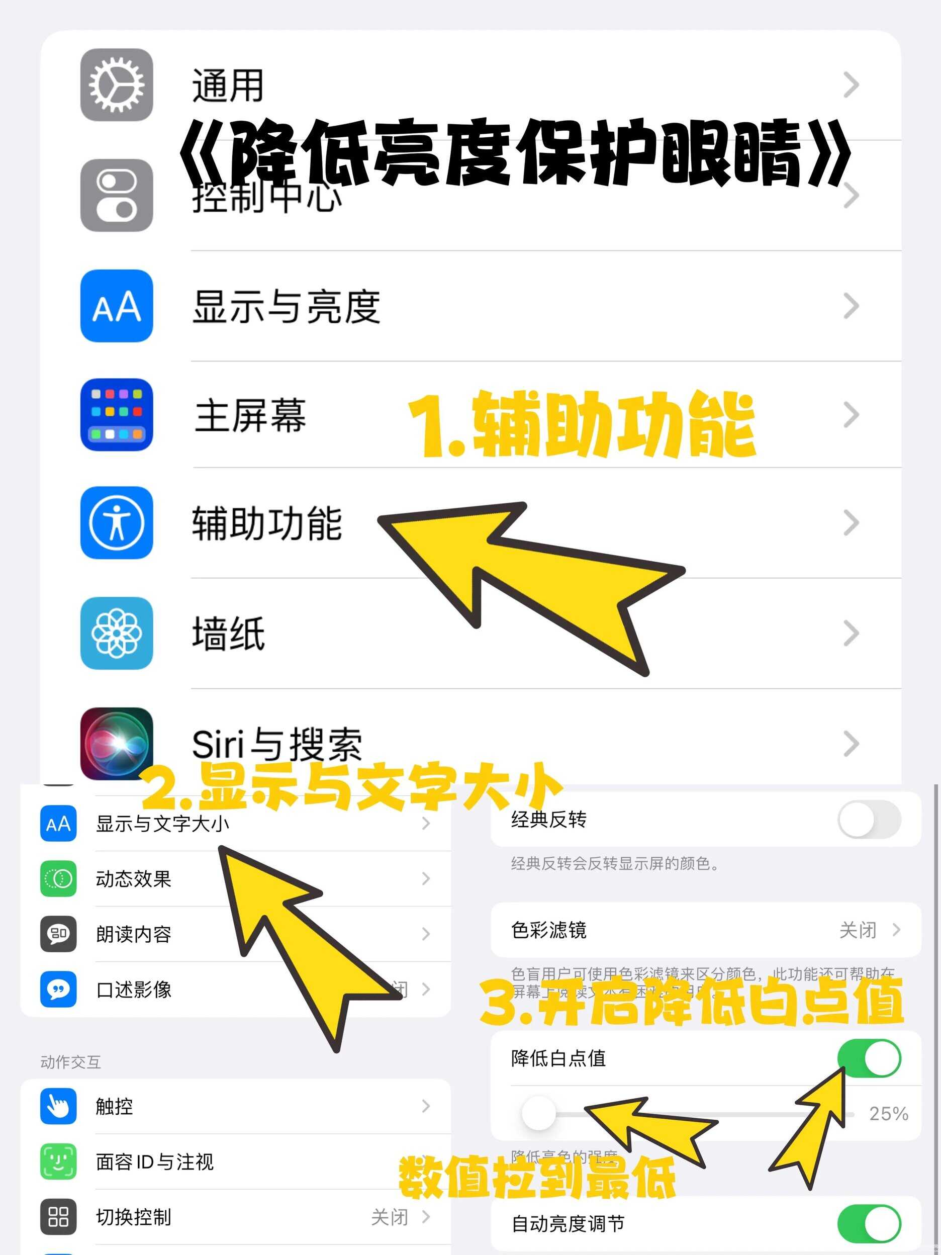 3⃣️设置-辅助功能-显示与文字大小-打开降低白点值将数值拉到25%(降低亮度保护眼睛)