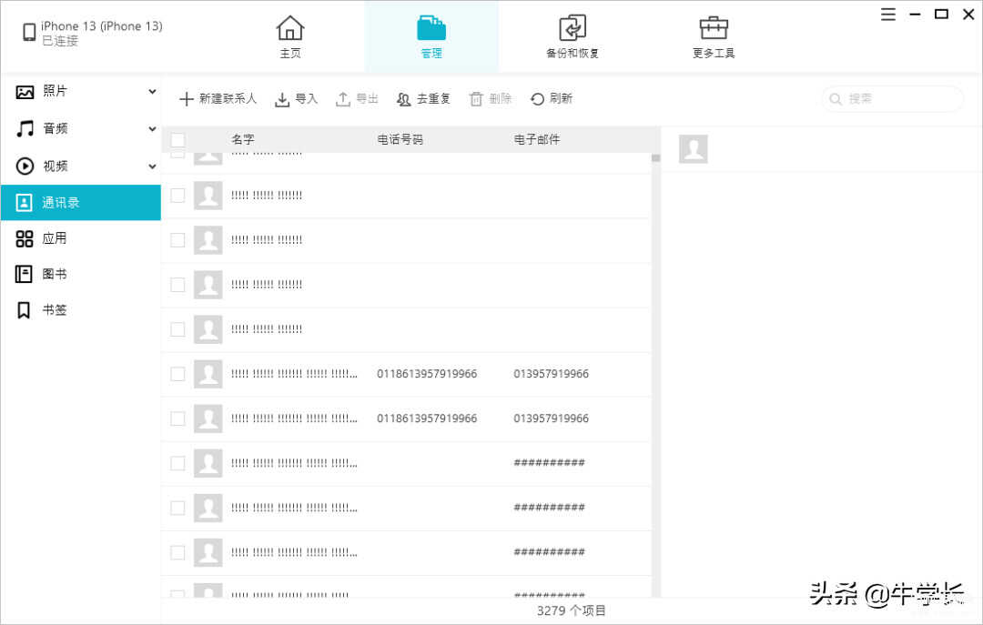 想要批量删除通讯录联系人,那么可以试试专业的牛学长苹果数据管理工具,还支持批量删除照片、备忘录、书签、视频等数据。